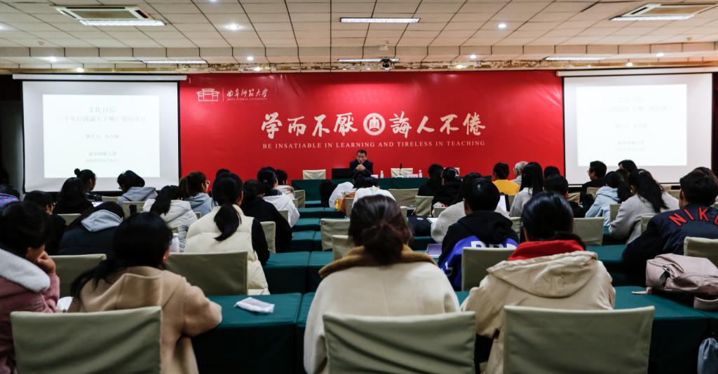 在我校访问期间,高天极一行参观了中国教师博物馆。高天极先生为我校教育科学学院和历史文化学院百余名学生做了专题报告。