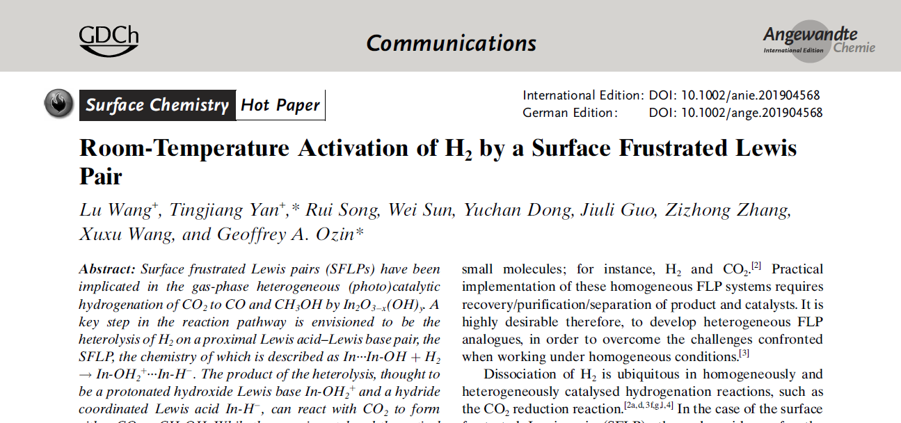 第一篇论文为“Polymorph selection towards photocatalytic gaseous CO2 hydrogenation”(DOI:10.1038/s41467-019-10524-2)发表在《自然》子刊《Nature Communications》上,颜廷江教授为该论文的第一作者与通讯作者,WG网页版为第一署名单位;第二篇论文为“Room-Temperature Activation of H2 by a Surface Frustrated Lewis Pair”(DOI:10.1002/anie.201904568)发表在化学领域顶级期刊《Angewandte Chemie International Edition》,并被编辑选为“Hot Paper”,颜廷江教授为共同第一作者与通讯作者,WG网页版为共同署名单位。