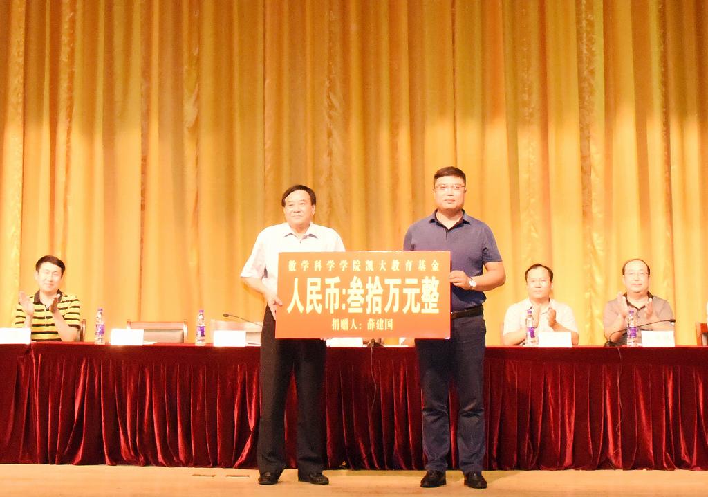 仪式上,薛建国向我校捐赠人民币三十万元,设立“凯大教育基金”,用于奖励数学优秀学子和办学环境改造。冯冲代表学校接受捐赠并为薛建国颁发大学生创业导师、数学科学学院兼职教师聘书,感谢其对母校建设与发展的关心与支持。