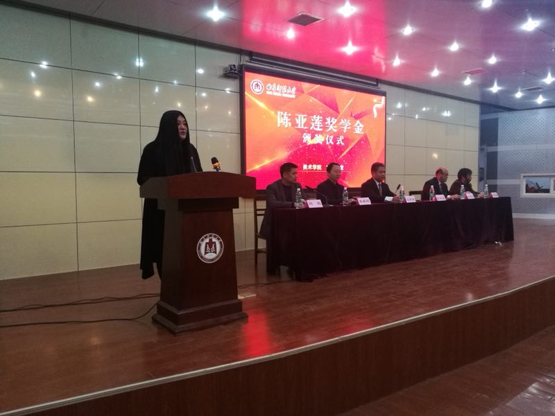仪式宣布了2017年度“陈亚莲奖学金”获得者名单。获奖学生代表在仪式上发言,对学校的培养与校友的支持表达了衷心的感谢。颁奖仪式结束后,与会领导和嘉宾参观了美术学院“陈亚莲奖学金”获奖学生作品展。