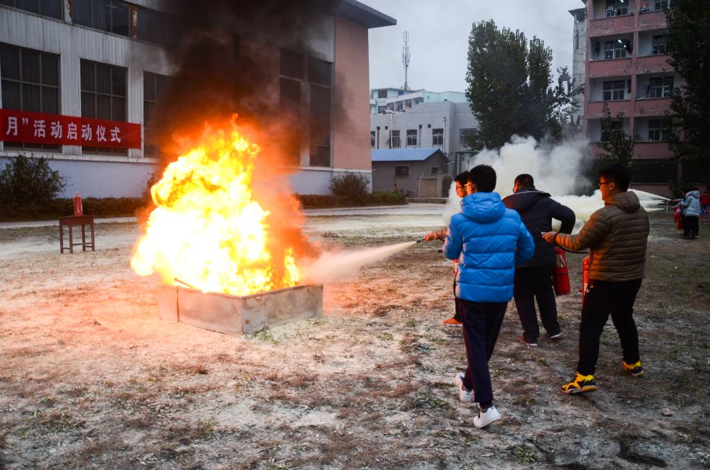 消防演练活动由消防车车操表演、灭火器使用讲解和灭火演练三部分组成。首先进行消防车车操表演,消防官兵听到警铃后身迅速下车,从器材箱拿出消防水枪和水带,打水带、接水口、连水枪,快速喷射水柱。随后,曲阜市消防大队参谋张甲坤向师生详细地讲解灭火器使用方法及注意事项。最后消防演练实战环节,师生代表齐上阵,在专业人员的指导下,亲身体验灭火器的实际操作。